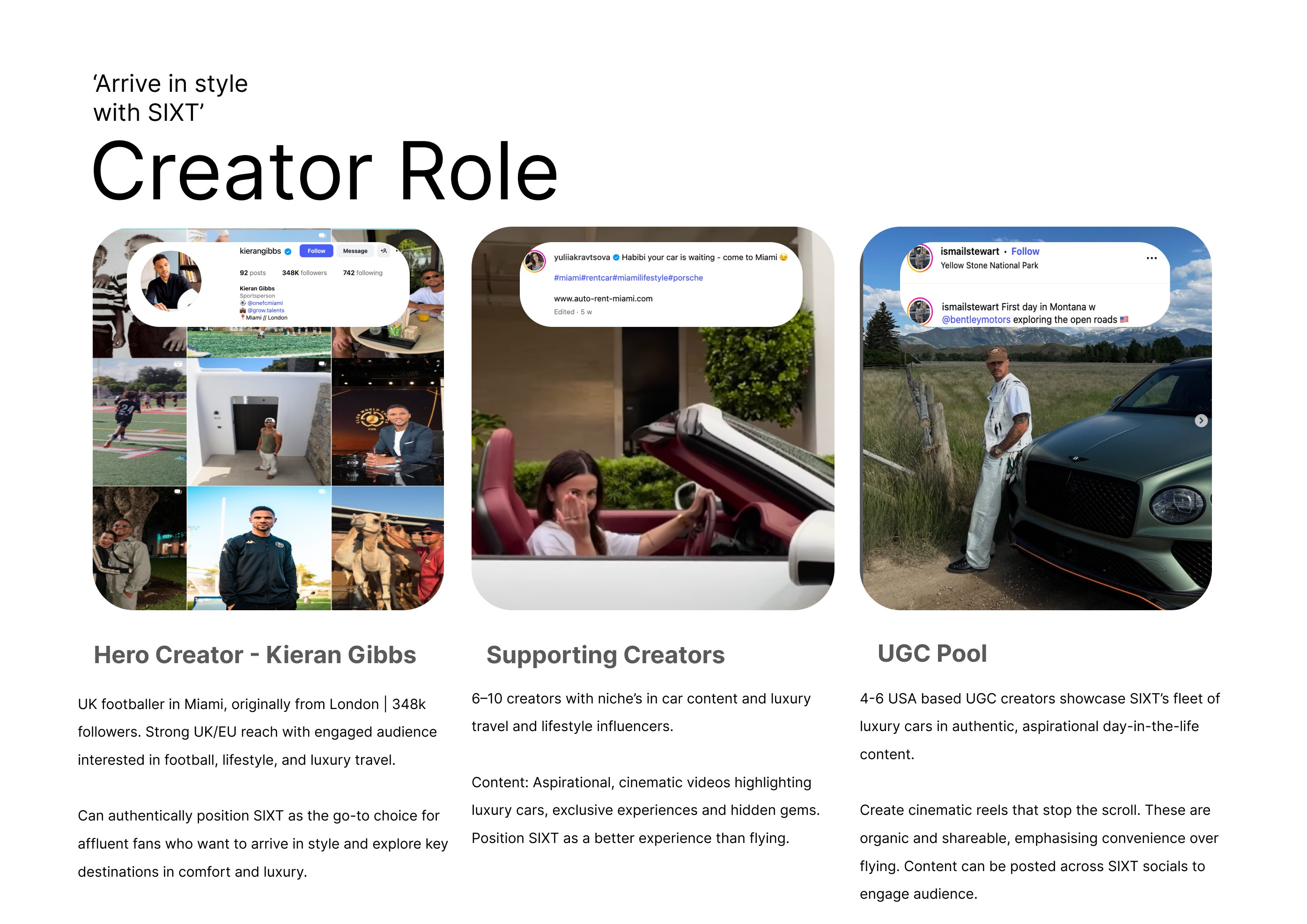 The Moment Summer 2026 brings a premium traveller surge, with social feeds dominated by “arrive-in-style” luxury travel and car culture content. Cultural Insight Affluent UK/EU travellers want to signal status and maximise content moments. Renting a luxury car is both practical and elevates the entire trip. Positioning SIXT becomes the gateway to VIP summer travel - offering travellers a statement-making upgrade over internal flights. Why fly when you can arrive in this? Caption Ideas & Hooks SIXT is the better way to travel between cities. Use my exclusive code XYZ for $$ off your booking. Ditching the airport chaos for a G-Wagon > #PremiumTravel #LuxuryExperience #SIXTSUMMER
